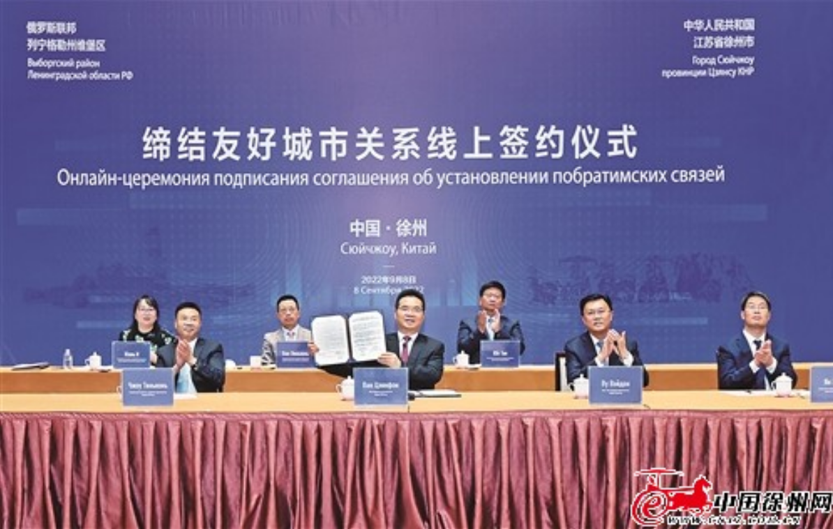 9月8日晚,徐州市与俄罗斯维堡区举行线上签约仪式,正式缔结友好城市关系。至此,徐州市国际友好城市增至20对,国际朋友圈进一步扩大。徐州市市长王剑锋,维堡区区长、议会主席德米特里·尼古林,政府行政长官瓦列里·萨维诺夫等出席活动并致辞,副市长吴卫东主持活动。