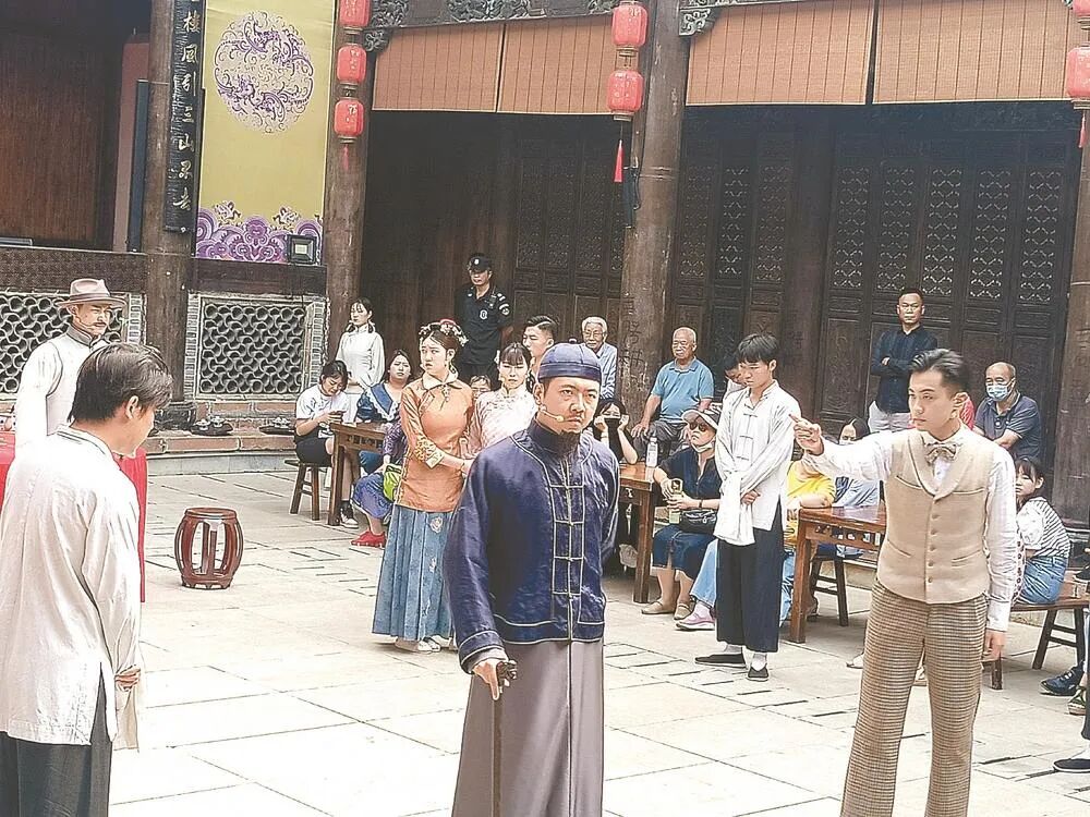 9月10日,一场好戏正在大洋湾盐渎古镇上演。现场看演员表演,游客自然体验大不一样。祠堂里,一砖一瓦、一桌一椅都透着古朴的气息。游客现场落座,安静无声,秩序井然,大家沉浸在剧情之中,演员声情并茂的表演感染着每一个人。