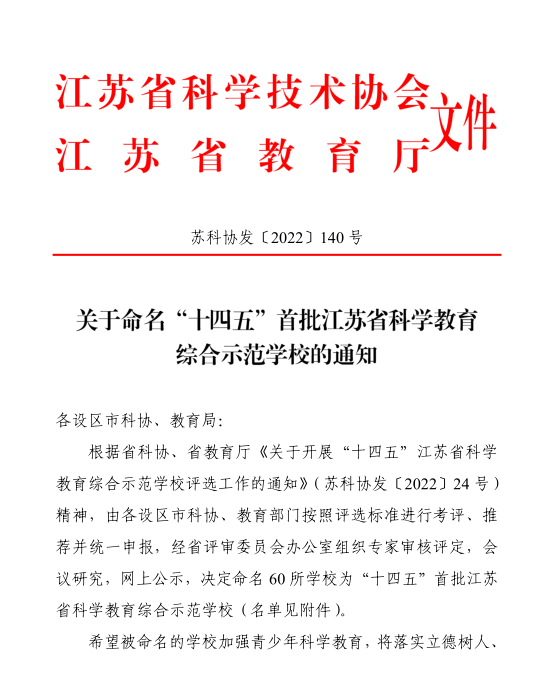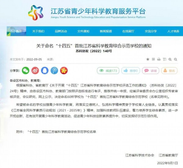 日前,“十四五”首批江苏省科学教育综合示范学校名单公布啦~