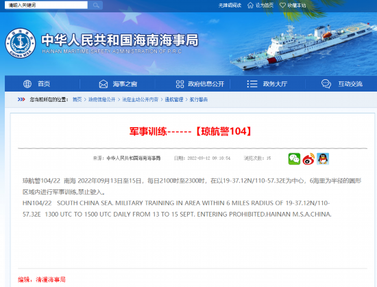央视新闻消息,清澜海事局发布琼航警104/22,南海 2022年09月13日至15日,每日21时至23时,在以19-37.12N/110-57.32E为中心,6海里为半径的圆形区域内进行军事训练,禁止驶入。详情>>