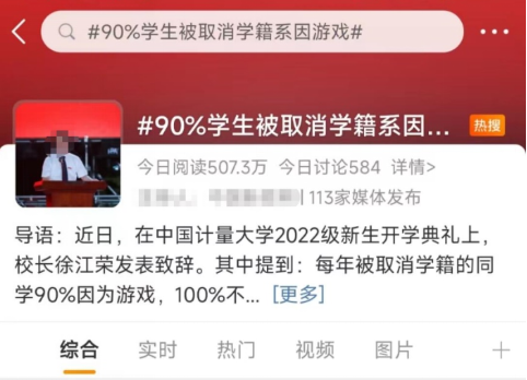 不久前,在中国计量大学2022级新生开学典礼上,校长徐江荣发表致辞,其中提到“网络游戏是最大的校园毒品”,每年被取消学籍的同学90%因为游戏,“100%不值得同情。”