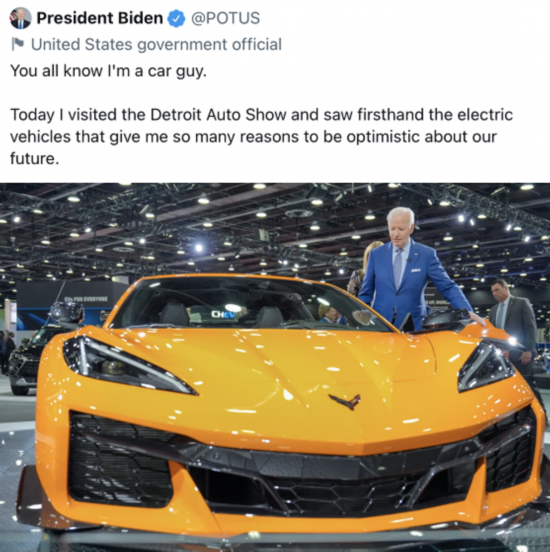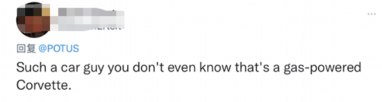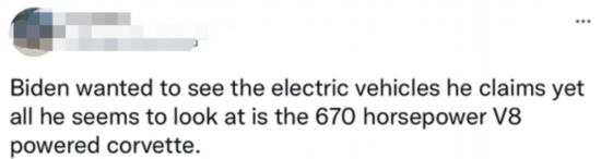 拜登的推文在网络上引发关注。有网友评论称:“拜登想看他所谓的电动车,但他看起来关注的是670马力V8引擎的科尔维特。”↓