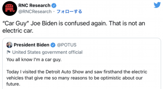 拜登这则推文也引来美国共和党的嘲讽,由共和党全国委员会(RNC)运营的推特账号“RNC调查”引用拜登推文评论称,“‘汽车迷’拜登又糊涂了。这不是辆电动车”。↓