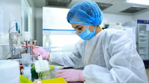↑科研人员在哈萨克斯坦努尔苏丹的中哈农业科学联合实验室工作(2021年4月7日摄)。2021年,中哈农业科学联合实验室获得哈萨克斯坦贸易和一体化部颁发的认可证书,正式开始运行,帮助消除两国农产品贸易中出现的技术性障碍。