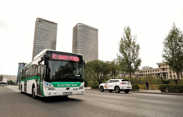 ↑宇通牌电动公交车行驶在哈萨克斯坦努尔苏丹的道路上(2022年9月10日摄)。中国宇通客车股份有限公司和哈萨克技术公司合资建设的CKD工厂生产纯电动客车及符合欧V排放标准的环保公交车。