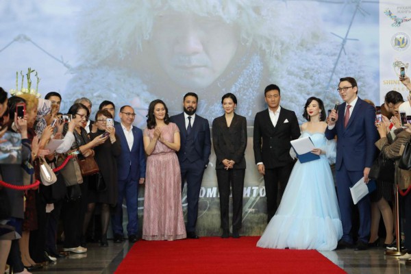 ↑中国与哈萨克斯坦首部合拍电影《音乐家》主创人员在努尔苏丹出席首映式(2019年5月17日摄)。影片讲述音乐家冼星海于二战期间辗转来到阿拉木图,在残酷环境下得到哈萨克斯坦音乐家救助的故事。