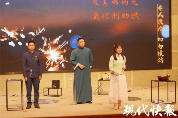 与董毅不同,来自江苏科技馆的表演团队带来了集科学实验秀与脱口秀为一体的节目——《燃之有理》。舞台上时不时火花四溅,震撼又酷炫。团队里的三人配合默契,通过亲自演示、互动讲解等方式,向观众科普了冷焰火和喷花机的特点,以及钢丝棉焰火等网红烟花背后暗藏着的诸多安全隐患。