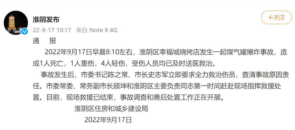 荔枝新闻讯 9月17日早晨8:10左右,江苏淮安市淮阴区幸福城烧烤店发生一起煤气罐爆炸事故,造成1人死亡,1人重伤,4人轻伤,受伤人员均已及时送医救治。