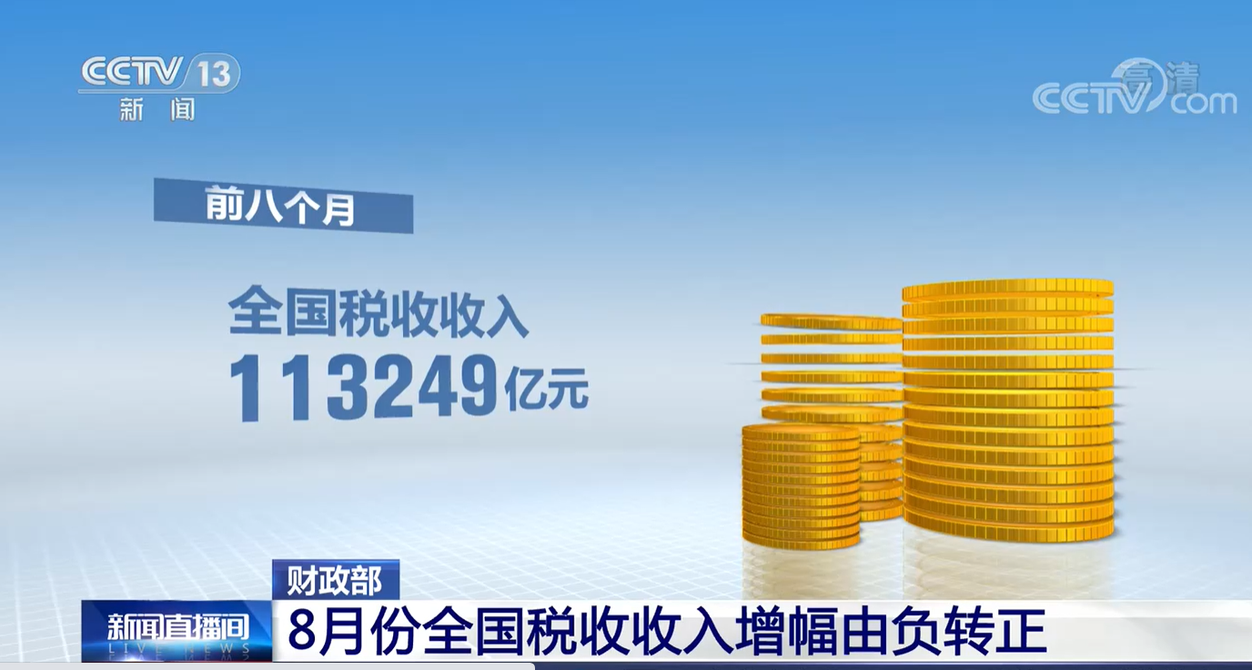 [新闻直播间]财政部 8月份全国税收收入增幅由负转正