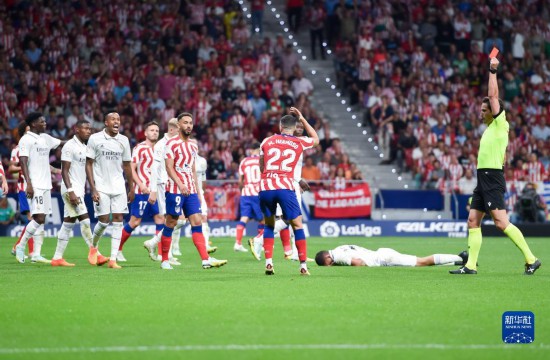 9月18日,马德里竞技队球员埃尔莫索(右三)在比赛中被红牌罚下。新华社发(古斯塔沃·巴连特摄)