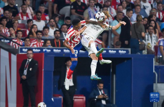 9月18日,马德里竞技队球员雷尼尔多(左)和皇家马德里队球员莫德里奇在比赛中争顶头球。新华社发(古斯塔沃·巴连特摄)
