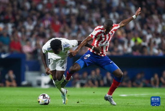 9月18日,马德里竞技队球员孔多比亚(右)和皇家马德里队球员琼阿梅尼在比赛中拼抢。新华社发(古斯塔沃·巴连特摄)