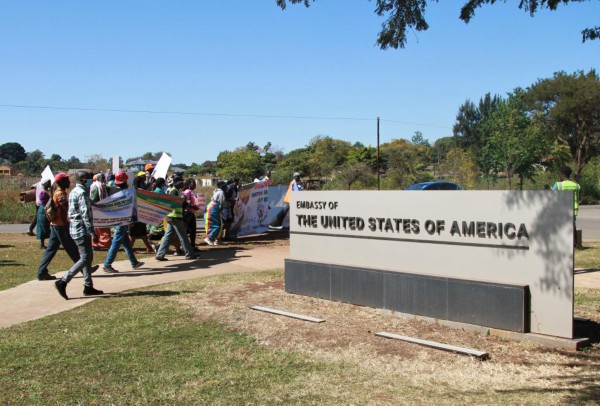 7月4日,在津巴布韦首都哈拉雷的美国驻津使馆门前,津巴布韦“广泛反对制裁联盟”组织成员举行抗议活动,反对美国及其西方盟友对津巴布韦的长期经济制裁。新华社发(塔法拉·穆瓜拉摄)