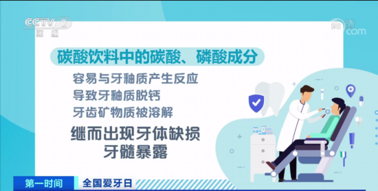 医生介绍,碳酸饮料中的碳酸、磷酸成分,容易与牙釉质产生反应,导致牙釉质脱钙,牙齿矿物质被溶解,继而出现牙体缺损、牙髓暴露。医生建议应减少碳酸饮料的摄入,饮用后应及时漱口,但不建议喝完马上刷牙。