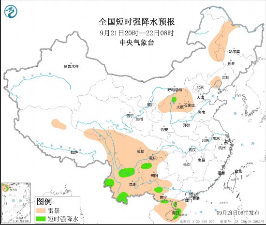 预计9月21日08时至22日08时,四川南部、云南西北部和南部、广西东部和西部、广东中部和西南部、海南岛等地的部分地区将有短时强降水天气,小时雨量20-40毫米,局地可达60毫米以上。