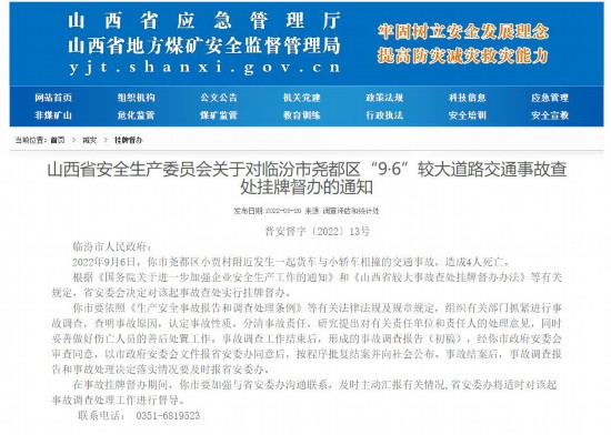 近日,山西省安全生产委员会发布《关于对临汾市尧都区“9·6”较大道路交通事故查处挂牌督办的通知》。
