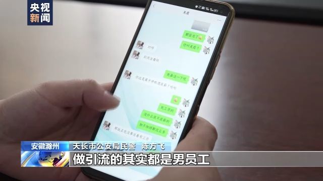 安徽省天长市公安局民警 陈方飞:他们这个犯罪团伙里面有个岗位叫“引流”,做“引流”的其实都是男员工,在他们内部也叫“运营”。他们利用女主播的头像去注册社交账号,也会发一些女主播的日常生活视频在这个账号上,然后在各个社交平台上物色男性客户,主动去搭讪,吸引他们的关注。