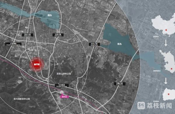 该社区位于宜兴环科园,紧邻龙背山森林公园及宜兴国家森林公园,北侧为东氿和西氿。项目自6月28日启动全球征集后,共收到30家申请人参与报名。经过多次评审,项目概念方案最终由悉地国际设计顾问(深圳)有限公司与隈研吾建筑都市设计事务所联合体设计。