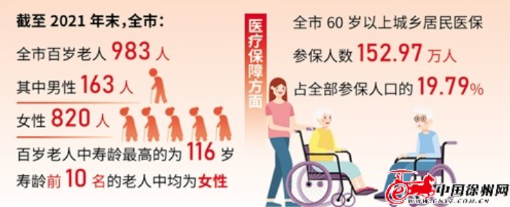 2021年末,全市百岁老人983人,其中男性163人,女性820人。百岁老人数量前三位的是邳州市、丰县、睢宁县,分别为193人、166人和139人。每10万人中百岁老人数前三位的是丰县、沛县、邳州市,分别为13.88人、10.57人、10.06人。百岁老人中寿龄最高的为116岁,寿龄前10名的老人中均为女性。