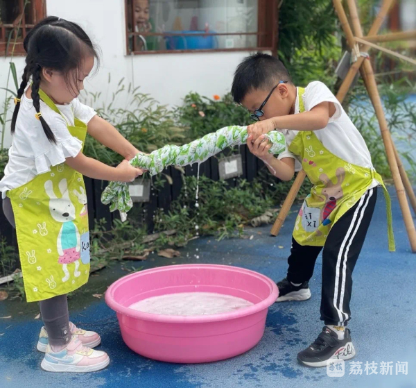 吴江区同里幼儿园积极引导幼儿尝试使用多样的洗涤工具和用品来进行清洗、晾晒、折叠、收纳等劳动体验活动,培养了幼儿的劳动兴趣、习惯、能力及品质。