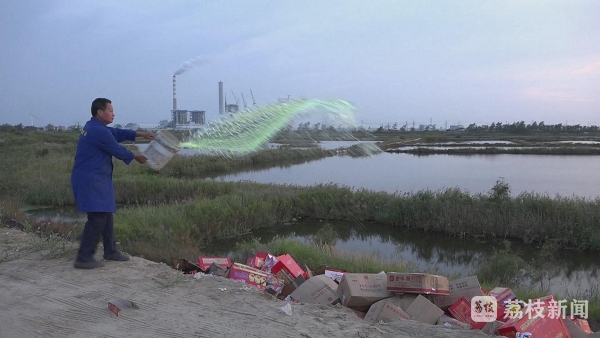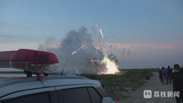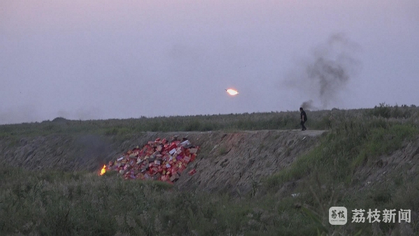 下午4点多钟,江苏射阳沿海滩涂的一处空旷地带上,几名装卸工人正在将专用运输车辆装运过来的烟花爆竹搬运下车,然后抛到旁边的深沟里。晚上6点钟左右,准备销毁的9000余件(只)烟花爆竹全部堆放到深沟里。随后,装卸工人浇上汽油,在现场指挥人员的一声令下,堆放在深沟内的烟花爆竹瞬间被点燃。一时间,沿海滩涂的上空烟花飞舞、轰鸣不断。