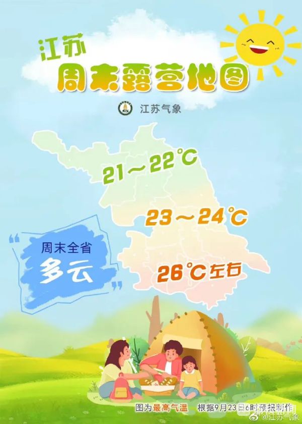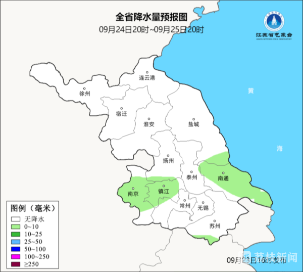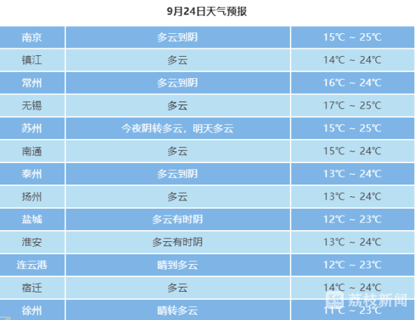 9月24日20时至9月25日20时,沿江和苏南地区多云转阴,部分地区有时有小雨,其他地区多云。最高温度:本省西部地区25~26℃,其他地区24℃左右;最低温度:沿淮和淮北地区16~17℃,其他地区18℃左右。