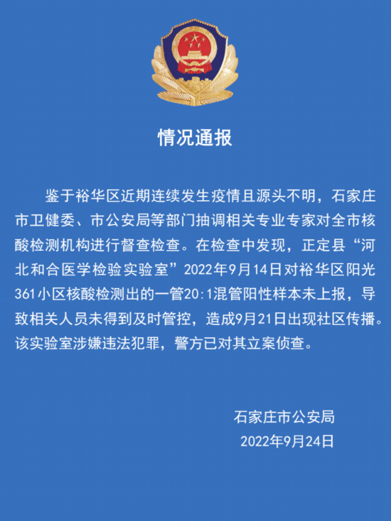 在检查中发现,正定县“河北和合医学检验实验室”2022年9月14日对裕华区阳光361小区核酸检测出的一管20:1混管阳性样本未上报,导致相关人员未得到及时管控,造成9月21日出现社区传播。