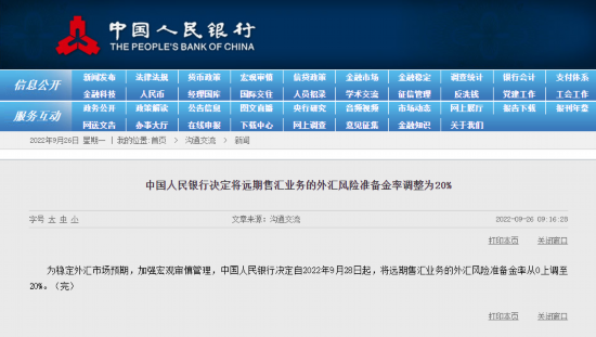 人民网北京9月26日电 为稳定外汇市场预期,加强宏观审慎管理,中国人民银行决定自2022年9月28日起,将远期售汇业务的外汇风险准备金率从0上调至20%。(记者罗知之)