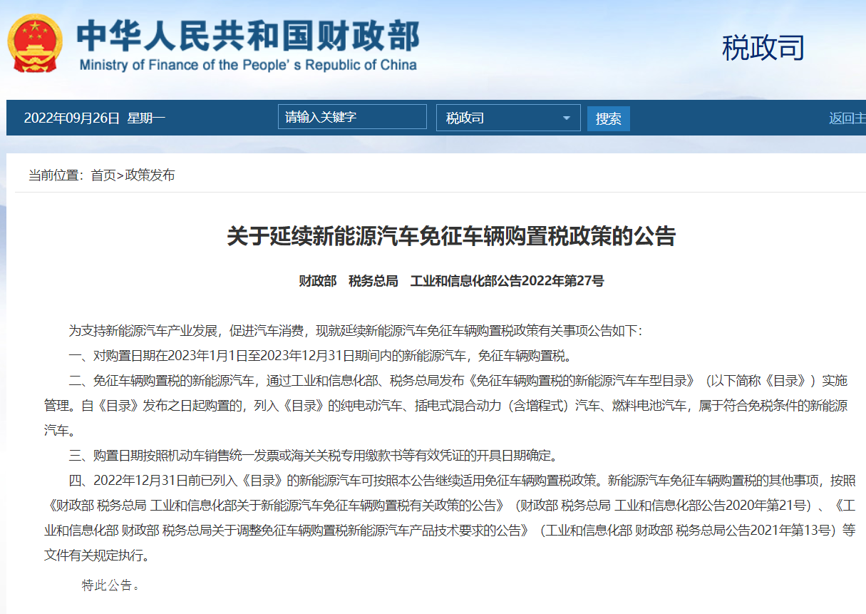财政部网站9月26日消息,财政部、税务总局、工业和信息化部发布关于延续新能源汽车免征车辆购置税政策的公告。