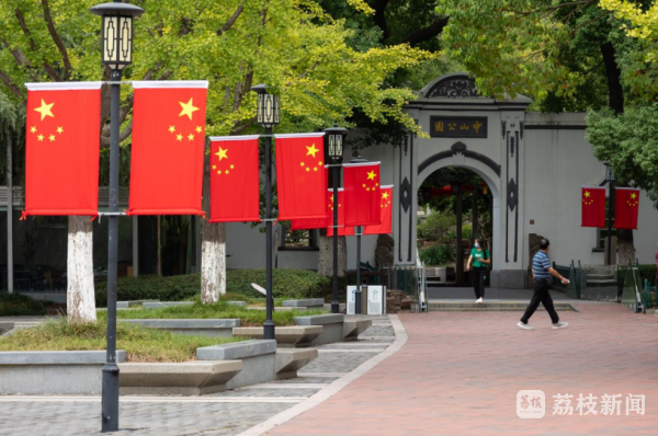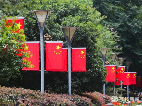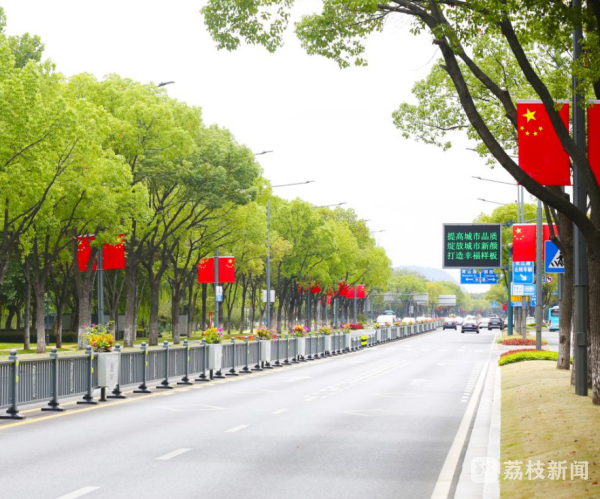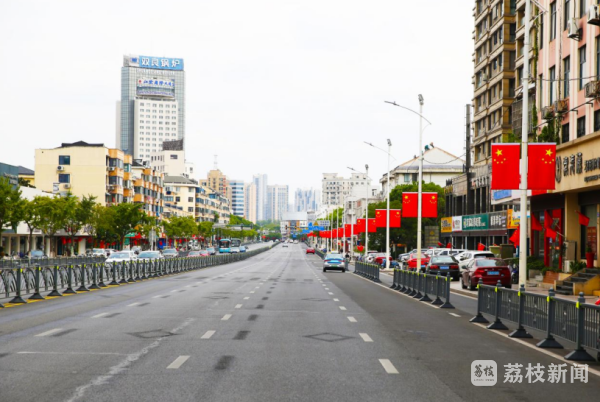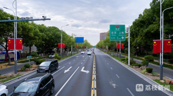 江阴主要交通道路两侧,纷纷挂起五星红旗,在绿树映衬下更显得熠熠生辉,一抹抹鲜艳的中国红,绘就国庆最美江阴风景线。