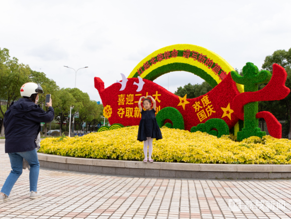 在文明广场,五星红旗迎风飘扬,巨型的国庆造景引来不少市民合影,过往市民都表示,看到“中国红”心中的自豪感油然而生。