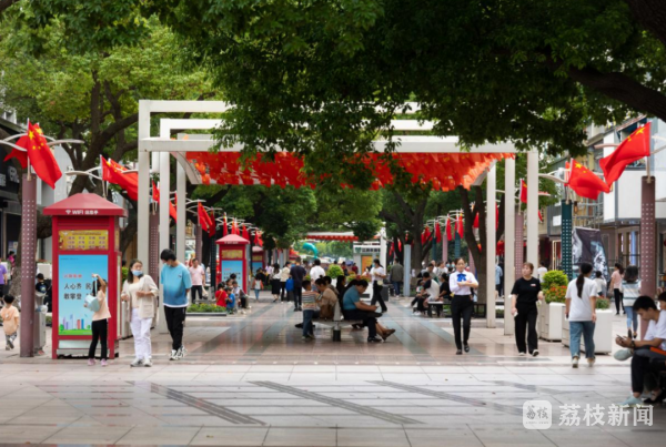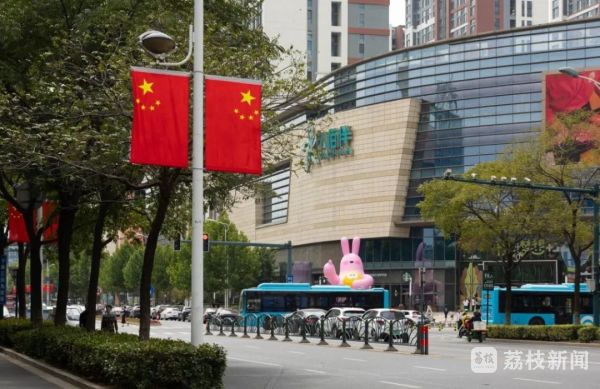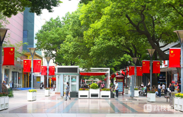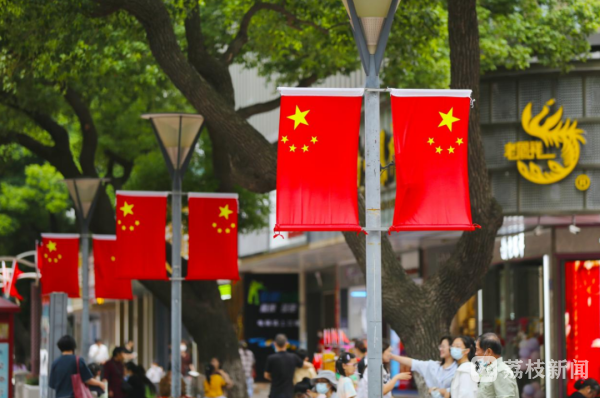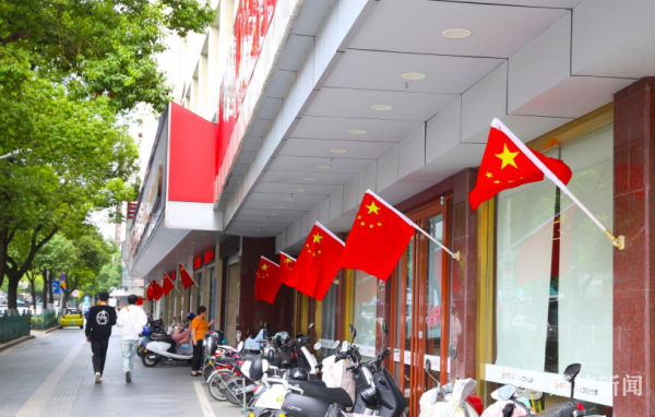 阳光下,红旗飘飘呈现一派盛世祥和景象,“处处都是‘中国红’,真美!”不少市民看到悬挂的五星红旗不由地赞道。