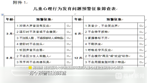 南京医科大学附属脑科医院儿童心理卫生研究中心所长柯晓燕:“孩子在三个月的时候,不能看着人脸微笑,到六七个月的时候,不能有来有往地跟你有回应式的牙牙学语,一岁左右的时候听力正常,但对自己的名字没有反应,还有16个月的时候没有说单词,以及18个月的时候不会跟随别人的指点,还有些孩子原本他会喊人了,但慢慢不说话了,任何时间出现的语言和社交技能的倒退,这些都称为早期的一些线索。”