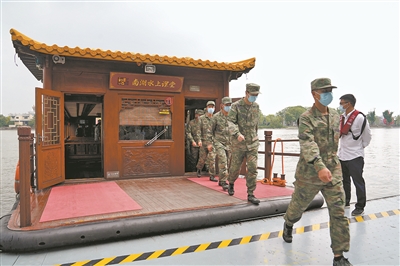 呼啸而过的火车、波光粼粼的湖面、1∶1等身幻影成像再现会议场景……置身南湖革命纪念馆,聚焦一个大党与一条小船的主题展《红船起航》,通过宏大叙事与微观细节的有机结合,给准新兵们带来身临其境的感受。真实的历史、翔实的资料、鲜活的事例……在沉浸式体验中,红色基因悄然植入准新兵心底。