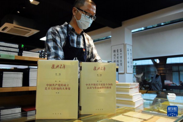 9月27日,工作人员在北京中华书局伯鸿书店整理刚刚到店的《复兴文库》大型历史文献丛书。