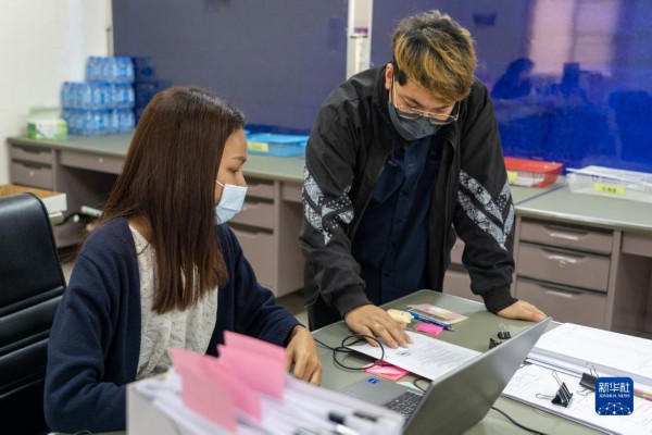 9月7日,在泰国呵叻,中泰铁路项目部监理总站专职翻译南塔蓬(右)与同事讨论工作。新华社记者 林昊 摄