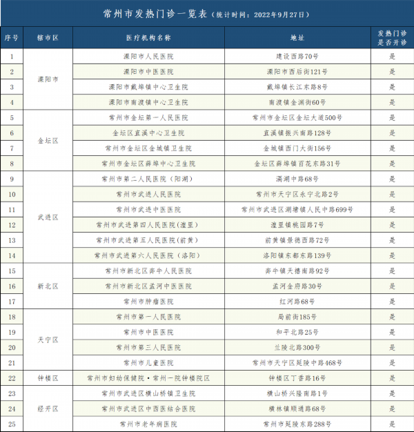 常州市发热门诊一览表