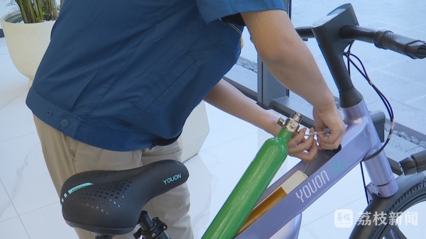 记者看到,这款采用镁铝合金架构的氢能自行车,整车重量27kg左右,行车时速最高22km/h,0.7L的储氢器可以连续骑行2.5小时续航里程55公里,能有效解决城市市民的零碳环保、便捷快速的通勤出行需求。