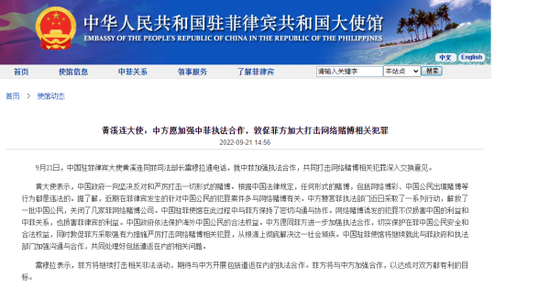 对于菲律宾打击网络赌博相关犯罪,中国驻菲律宾大使黄溪连日前表示,中方赞赏菲执法部门近日采取的一系列行动。网络赌博诱发的犯罪不仅损害中国的利益和中菲关系,也损害菲律宾的利益。中方愿同菲方进一步加强执法合作,切实保护在菲中国公民安全和合法权益,同时敦促菲方采取强有力措施严厉打击网络赌博相关犯罪,从根源上彻底解决这一社会顽疾。