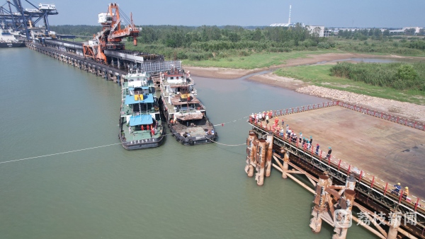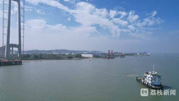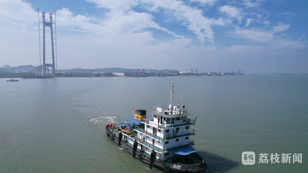 9月29日,南京仙新路过江通道上部结构施工现场,牵引船拽拉着先导索,跨越1760米的长江水域,从南主塔牵引至北主塔,南、北主塔实现“隔江牵手”。