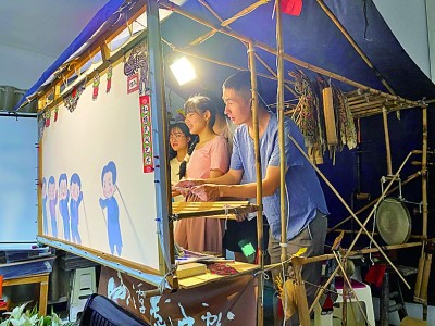 湘潭大学“湘影笙笙”团队的学生与纸影非遗传承人吴渊一起排练党史剧目。傅燕翔摄/光明图片
