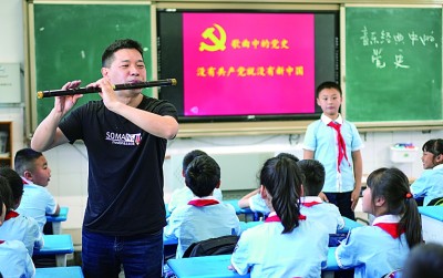 重庆九龙坡区铁路小学的音乐老师在为学生吹奏红色经典乐曲《没有共产党就没有新中国》。新华社发