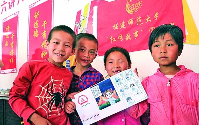 宁夏西吉县高同村村部小学的学生在欣赏福建师范大学“红传航道”团队制作的红色漫画。光明图片