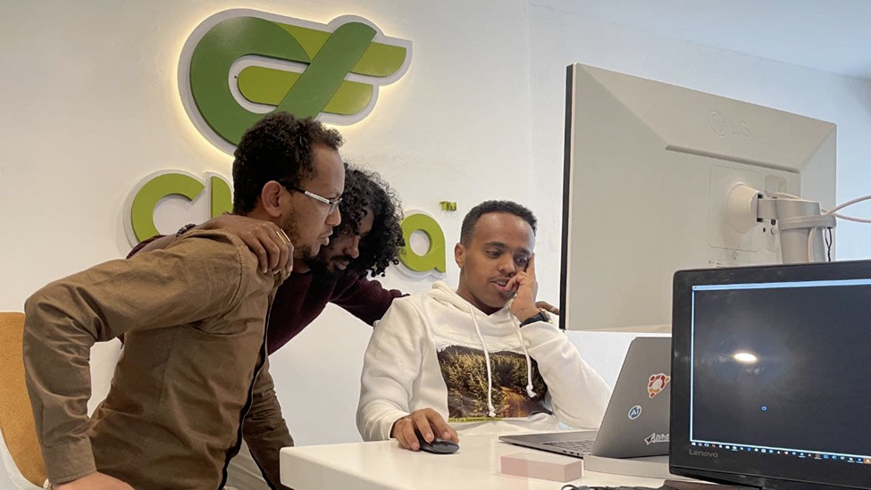 内尔(右一)和他的创业团队在位于埃塞俄比亚首都亚的斯亚贝巴的公司工作。受访者供图