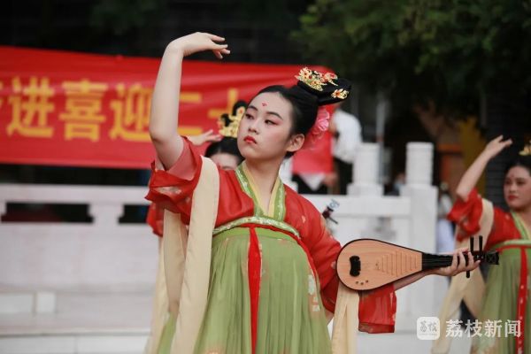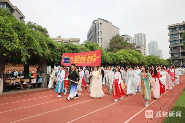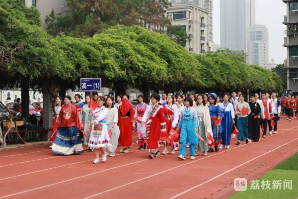 高一年级同学们服饰色彩鲜明,当他们身穿壮族、苗族、维族、藏族、彝族等民族服饰入场时,现场响起阵阵掌声。
