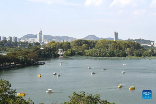 Photo taken on Oct. 3, 2022 shows tourists taking boats at the Xuanwu Lake Park in Nanjing, east China's Jiangsu Province. (Photo by Yang Suping/Xinhua)