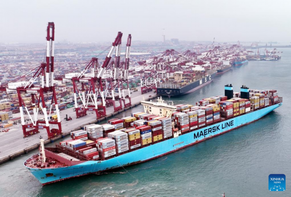 Aerial photo taken on July 29, 2022 shows a Maersk container vessel departing from the Qianwan Container Terminal in Qingdao Port, east China's Shandong Province. (Xinhua/Li Ziheng)