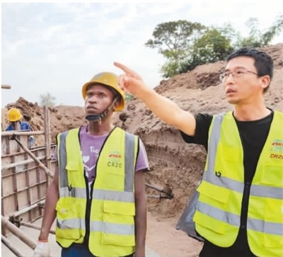 郭治南(右)在指导参与建设马尔卡至班古拉铁路项目的当地工人进行涵洞施工。