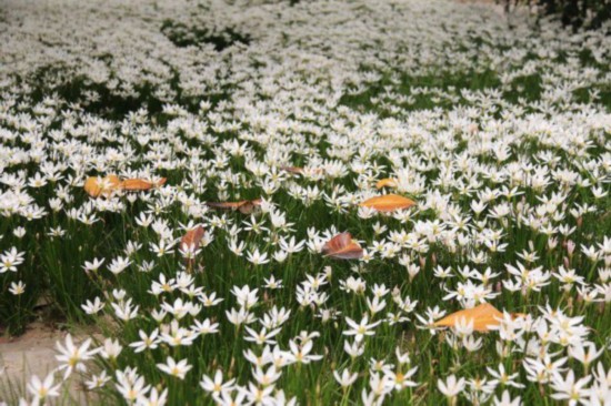 看,洁白的葱兰簇拥成片、纯真坚韧,映照硕果累累的金秋。