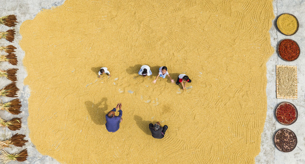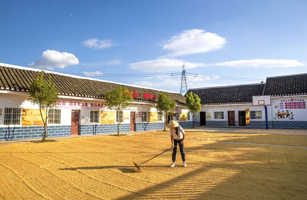 湖北省宜昌市秭归县农民抢抓农时晾晒作物,到处是一派丰收的景象。(王罡 摄)